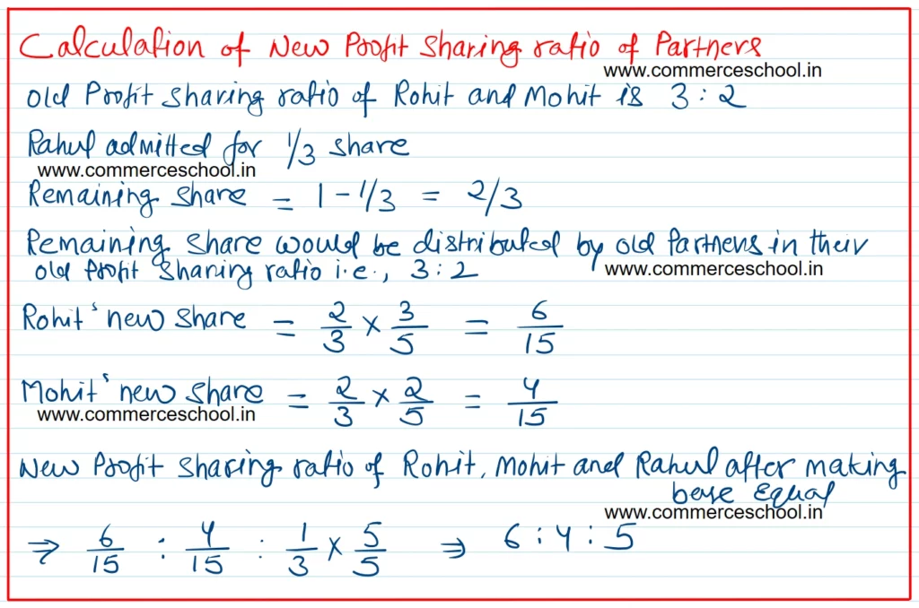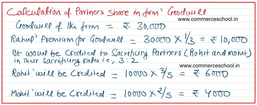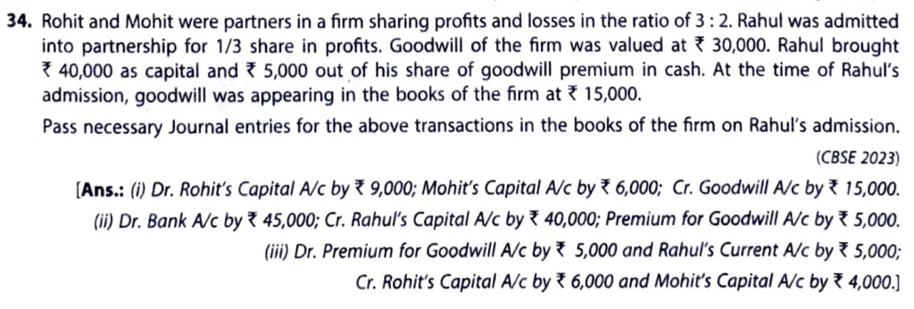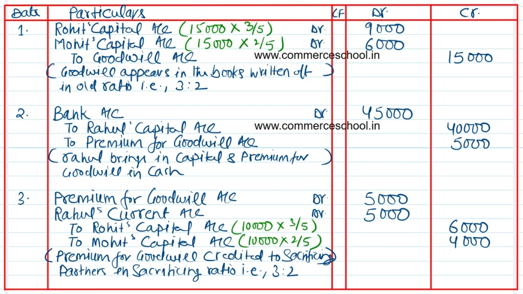 Rohit and Mohit were partners in a firm sharing profits and losses in the ratio of 3 : 2. Rahul was admitted into partnership for 1/3 share in profits. Goodwill of the firm was valued at ₹ 30,000. Rahul brought ₹ 40,000 as capital and ₹ 5,000 out of his share of goodwill premium in cash. At the time of Rahul’s admission, goodwill was appearing in the books of the firm at ₹ 15,000.