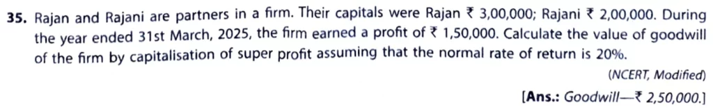 Rajan and Rajani are partners in a firm. Their Capitals were Rajan ₹ 3,00,000; Rajani ₹ 2,00,000. During the year ended 31st March 2023, the firm earned a profit of ₹ 1,50,000. Calculate the value of goodwill of the firm by capitalisation of super profit assuming that the normal rate of return is 20%.
