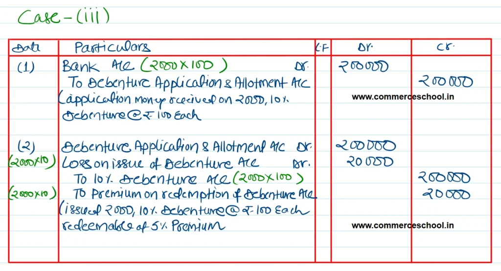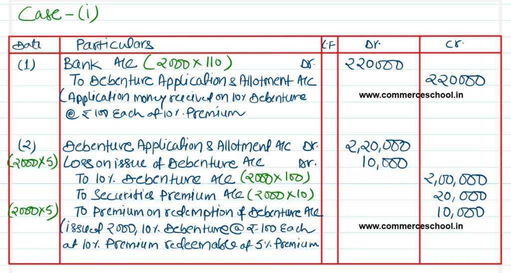 Chiranjeevi Limited issued 2,000, 10% Debentures of ₹ 100 each. Pass the necessary Journal entries for the issue of debentures in the following cases:
