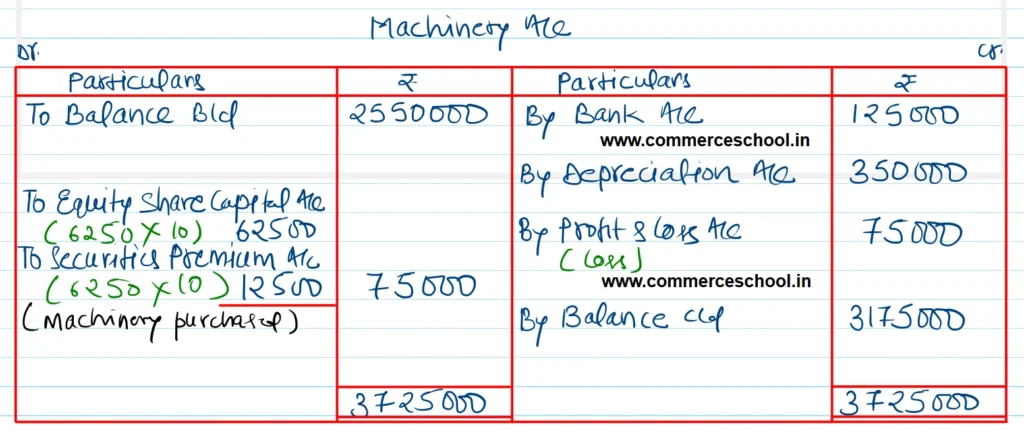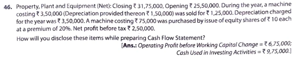 Property, Plant and Equipment (Net): Closing ₹ 31,75,000, Opening ₹ 25,50,000. During the year, a machine costing ₹ 3,50,000 (Depreciation provided thereon ₹ 1,50,000) was sold for ₹ 1,25,000. Depreciation charged for the year was ₹ 3,50,000. A machine costing ₹ 75,000 was purchased by issue of equity shares of ₹ 10 each at a premium of 20%. Net profit before tax ₹ 2,50,000.