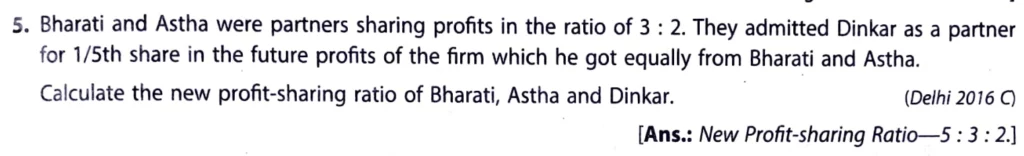 Bharati and Astha were partners sharing profits in the ratio of 3 : 2. They admitted Dinkar as a partner for 1/5th share in the future profits of the firm which he got equally from Bharati and Astha. Calculate the new profit-sharing ratio of Bharati, Astha, and Dinkar.