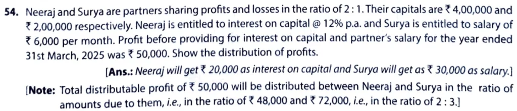 Neeraj and Surya are partners sharing profits and losses in the ratio of 2 : 1. Their capitals are ₹ 4,00,000 and ₹ 2,00,000 respectively. Neeraj is entitled to interest on capital @ 12% p.a. and Surya is entitled to salary of ₹ 6,000 per month. Profit before providing for interest on capital and partner’s salary for the year ended 31st March, 2025 was ₹ 50,000. Show the distribution of profits.