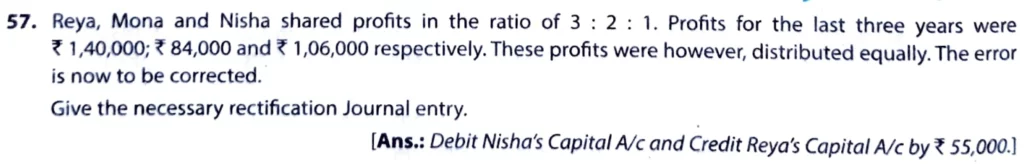 Reya, Mona, and Nisha shared profits in the ratio of 3 : 2 : 1. Profits for the last three years were ₹ 1,40,000; ₹ 84,000, and ₹ 1,06,000 respectively. These profits were by mistake distributed equally. The error is now to be corrected.