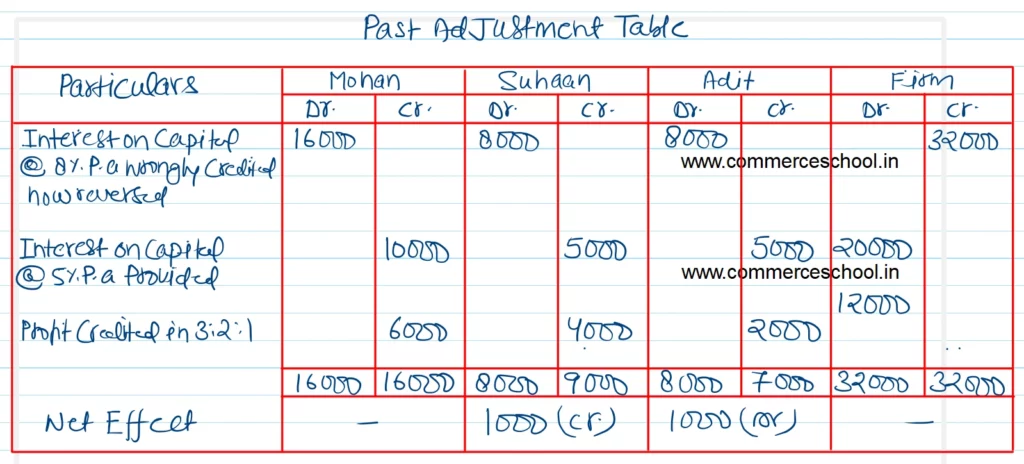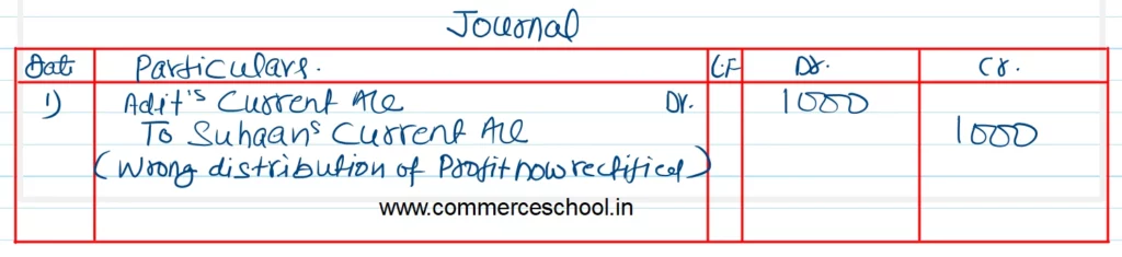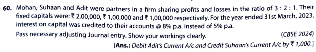 Mohan, Suhaan and Adit were partners in a firm sharing profits and losses in the ratio of 3 : 2 : 1. Their fixed capitals were: ₹ 2,00,000; ₹ 1,00,000 and ₹ 1,00,000 respectively. For the year ended 31st March, 2023, interest on capital was credited to their accounts @ 8% p.a instead of 5% p.a. Pass necessary adjusting Journal entry. Show your workings clearly.