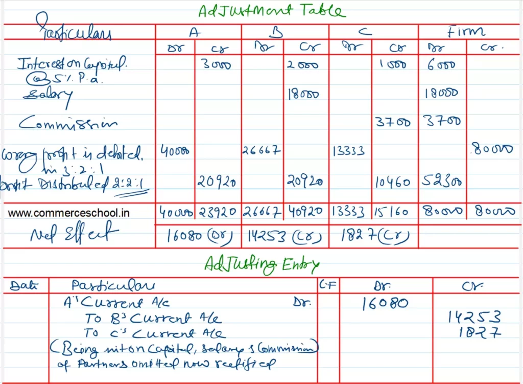 A, B, and C were partners. Their fixed Capitals were ₹ 60,000, ₹ 40,000, and ₹ 20,000 respectively. Their profit-sharing ratio was 2 : 2 : 1. According to the Partnership Deed, they were entitled on capital @ 5% p.a. In addition, B was also entitled to draw a salary of ₹ 1,500 per month. C was entitled to a commission of 5% on the profits after charging the interest on capital, but before charging the salary payable to B. The net profits for the year, ₹ 80,000, were distributed in the ratio of their capitals without providing for any of the above adjustments. Showing your workings clearly, pass the necessary adjustment entry. [CBSE 2019]