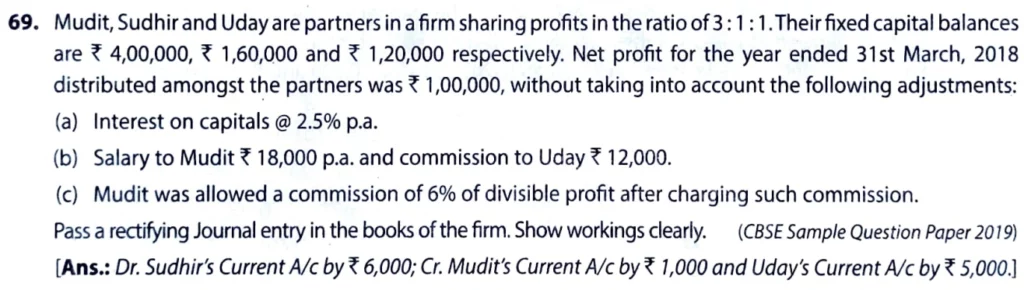 [Ans.: Dr. Sudhir’s Current A/c by ₹ 6,000; Cr. Mudit’s Current A/c by ₹ 1,000 and Uday’s Current A/c by ₹ 5,000.]