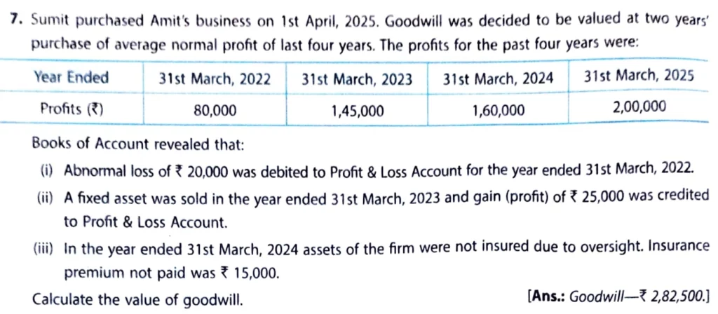 Sumit purchased Amit’s business on 1st April 2024. Goodwill was decided to be valued at two years’ purchase of average normal profit of the last four years. The profits for the past four years were: