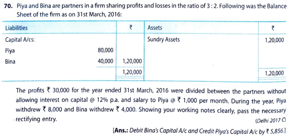 The Profits ₹ 30,000 for the year ended 31st March 2016 were divided between the partners without allowing interest on capital @ 12% p.a. and salary to Piya @ ₹ 1,000 per month. During the year, Piya withdrew ₹ 8,000 and Bina withdrew ₹ 4,000. Showing your working notes clearly. Pass the necessary rectifying entry.