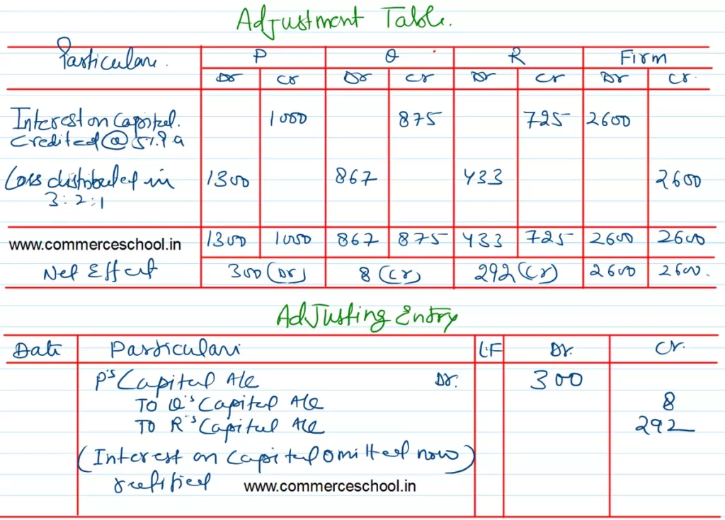 [Ans: Debit P’s Capital A/c by ₹ 300; Credit Q’s Capital A/c by ₹ 8 and R’s Capital A/c by ₹ 292]