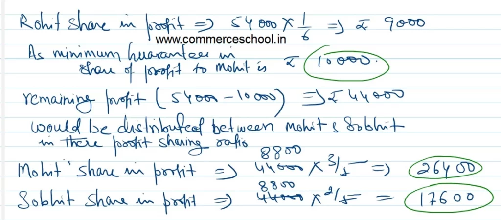 Mohit and Sobhit are partners sharing profits in the ratio of 3:2. Rohit was admitted for 1/6th share of profit with a minimum guaranteed profit of ₹ 10,000. At the close of the first financial year, the firm earned a profit of ₹ 54,000. Find the share of profit which Mohit, Sobhit, and Rohit will get.