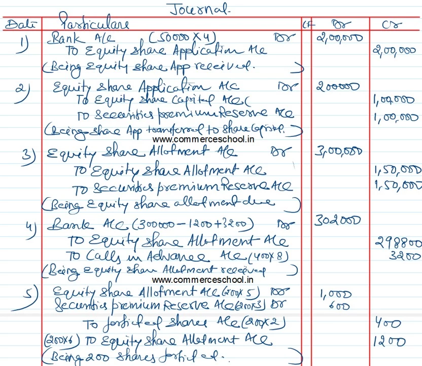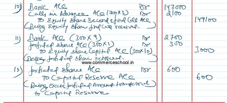[Ans.: Amount forfeited (after Allotment) – ₹ 400; Amount forfeited (after First Call) – ₹ 500; Amount transferred to Capital Reserve – ₹ 600; Money Received on Allotment – ₹ 3,02,000.]