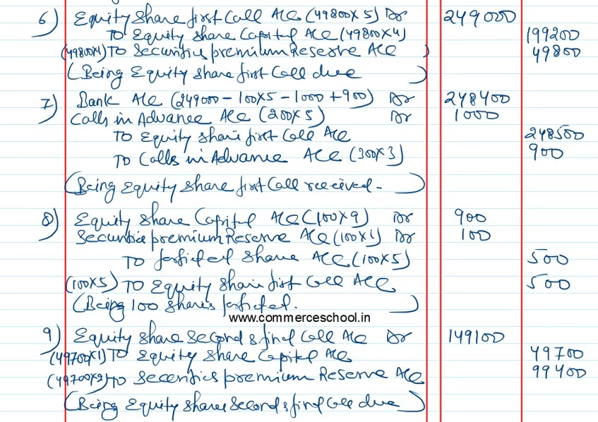 The issue was fully subscribed, Gopal, a shareholder holding 200 shares, did not pay the allotment money and Madhav, a holder of 400 shares paid his entire share money along with the allotment money, Gopal’s shares were immediately forfeited after allotment. Afterwords, the first call was made, Krishna, a holder of 100 shares, failed to pay the first call money and Girdhar, a holder of 300 shares, paid the second call money also along with the first call. Krishna’s shares were forfeited immediately after the first call. Second and final call was made afterwards and was duly received. All the forfeited shares were reissued at ₹ 9 per share fully paid-up.