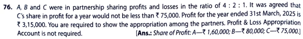 A, B, and C were in partnership sharing profits and losses in the ratio of 4 : 2 : 1. It was provided that C’s share in profit for a year would not be less than ₹ 75,000. Profit for the year ended 31st Mach, 2023 is ₹ 3,15,000. You are required to show the appropriation among the partners, Profit and Loss Appropriation account is not required.