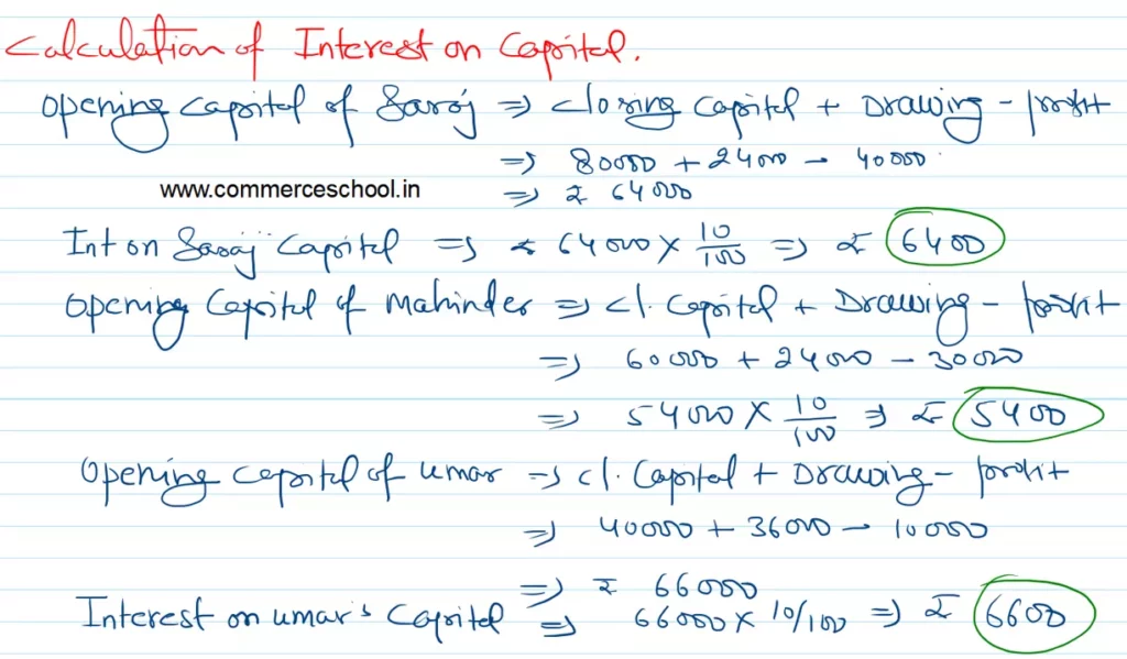 b) During the year Saroj and Mahiner each withdrew a sum of ₹ 24,000 in equal installments at the end of each month and Umar withdrew ₹ 36,000.