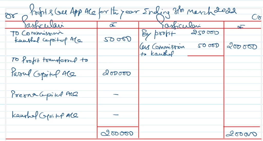 Parul, Prerna, and Kaushal are partners sharing profits equally. Parul is guaranteed a minimum annual profit of ₹ 2,00,000. Kaushal is to get a commission @ 5% of Net Sales and the commission is determined at ₹ 50,000. Net Profit for the year ended 31st March 2022 is ₹ 2,50,000.