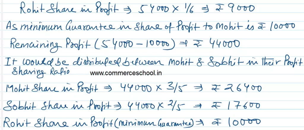 Mohit and Sobhit are partners sharing profits in the ratio of 3:2. Rohit was admitted for 1/6th share of profit with a minimum guaranteed profit of ₹ 10,000. At the close of the first financial year, the firm earned a profit of ₹ 54,000. Find the share of profit which Mohit, Sobhit, and Rohit will get.