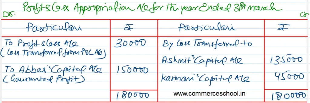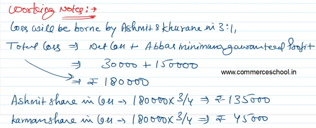Ashmit, Abbas, and Karman are partners sharing profits in the ratio of 3:2:1. Abbas is guaranteed a minimum profit of ₹ 1,50,000 per annum. The firm incurred a loss for the year ended 31st March 2022 of ₹ 30,000.