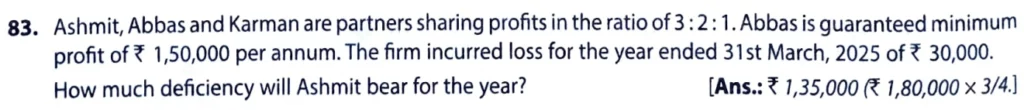 Ashmit, Abbas, and Karman are partners sharing profits in the ratio of 3:2:1. Abbas is guaranteed a minimum profit of ₹ 1,50,000 per annum. The firm incurred a loss for the year ended 31st March 2024 of ₹ 30,000.