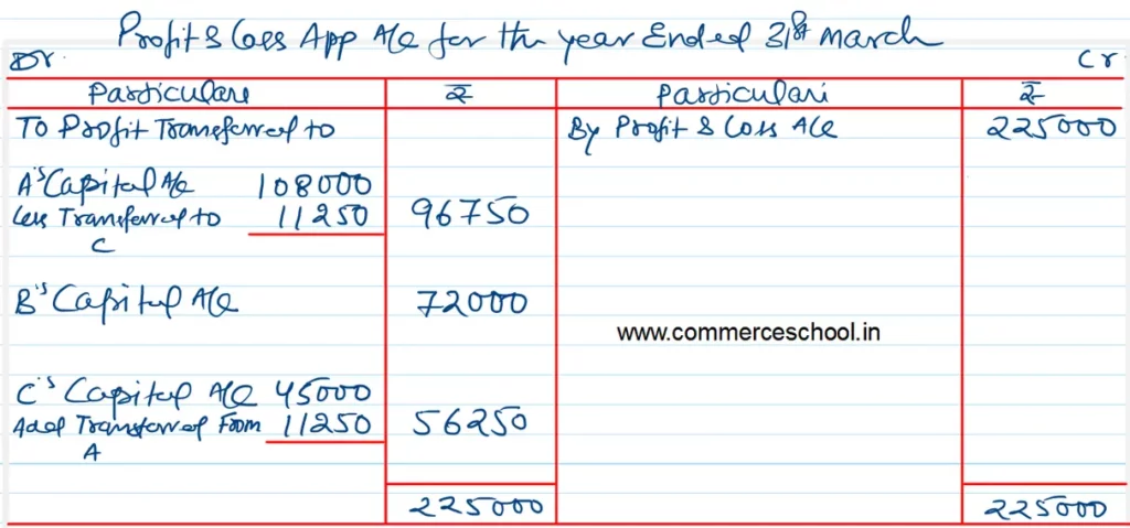 In terms of the Partnership deed, any excess amount, which C will be entitled to receive as a partner over the amount which would have been due to him if he continued to be the manager, will be borne by A, Profit for the year ended 31st March 2022 amounted to ₹ 2,25,000.