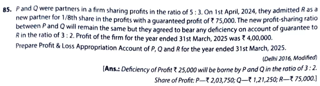 P and Q were partners in a firm sharing profits in the ratio of 5:3. On 1st April 2023 they admitted R as a new partner for 1/8th share in the profits with a guaranteed profit of ₹ 75,000. The new profit-sharing ratio between P and Q will remain the same but they agreed to bear any deficiency on account of the guarantee to R in the ratio of 3:2. The profit of the firm for the year ended 31st March 2024 was ₹ 4,00,000.
