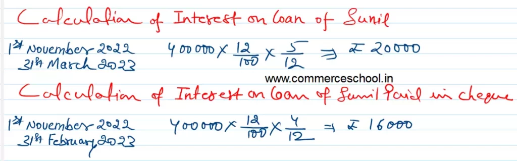 [Ans: Interest on Loan by Sunil up to February 2023 – ₹ 16,000; Interest transferred to Profit and Loss a/c – ₹ 20,000.]