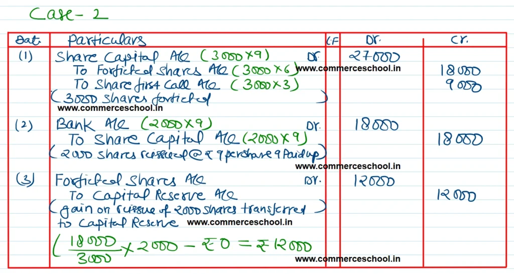 (ii) Mamta Ltd. forfeited 3,000 shares of ₹ 10 each on which the first call of ₹ 3 per share was not received. The second and final call of ₹ 1 per share was not yet called. Out of these, 2,000 shares were reissued at ₹ 9 per share, ₹ 9 paid-up.