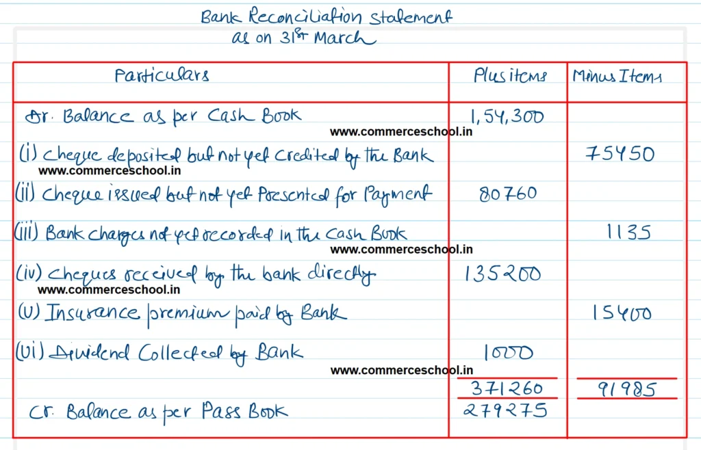 Q. 1. Ram Zin Ltd. maintains a current account with the State Bank of India. On 31st March, 2023, the bank column of its cash book showed a debit balance of ₹ 1,54,300. However, the bank statement showed a different balance as on that date. The following were the reasons for the difference: