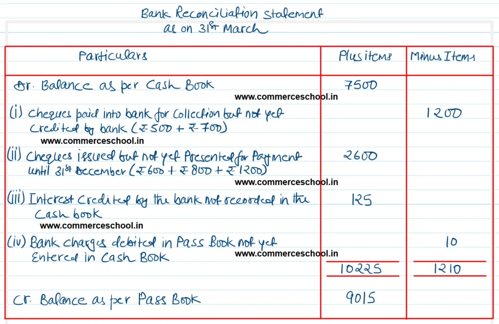 Q. 2. The balance of cash at bank as shown by the Cash Book of Pan & Co. on 31st December, 2024, was ₹ 7,500. On checking the entries in the Cash Book with the Pass Book, it was ascertained that cheques of ₹ 500 and ₹ 700 respectively paid in on 30th December, were not credited until the 2nd January following and three cheques of ₹ 600, ₹ 800 and ₹ 1,200 issued on the 28th December were not presented until the 3rd of January.