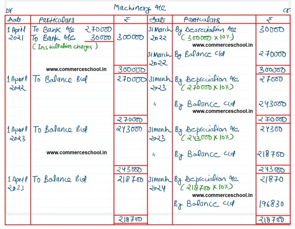A plant is purchased for ₹ 2,70,000 on 1st April, 2021. Installation charges paid on the plant is ₹ 30,000. It is estimated that the residual value of this plant at the end of its working life of 10 years will be ₹ 71,230. Depreciation is to be provided at 10% p.a. on diminishing balance method.