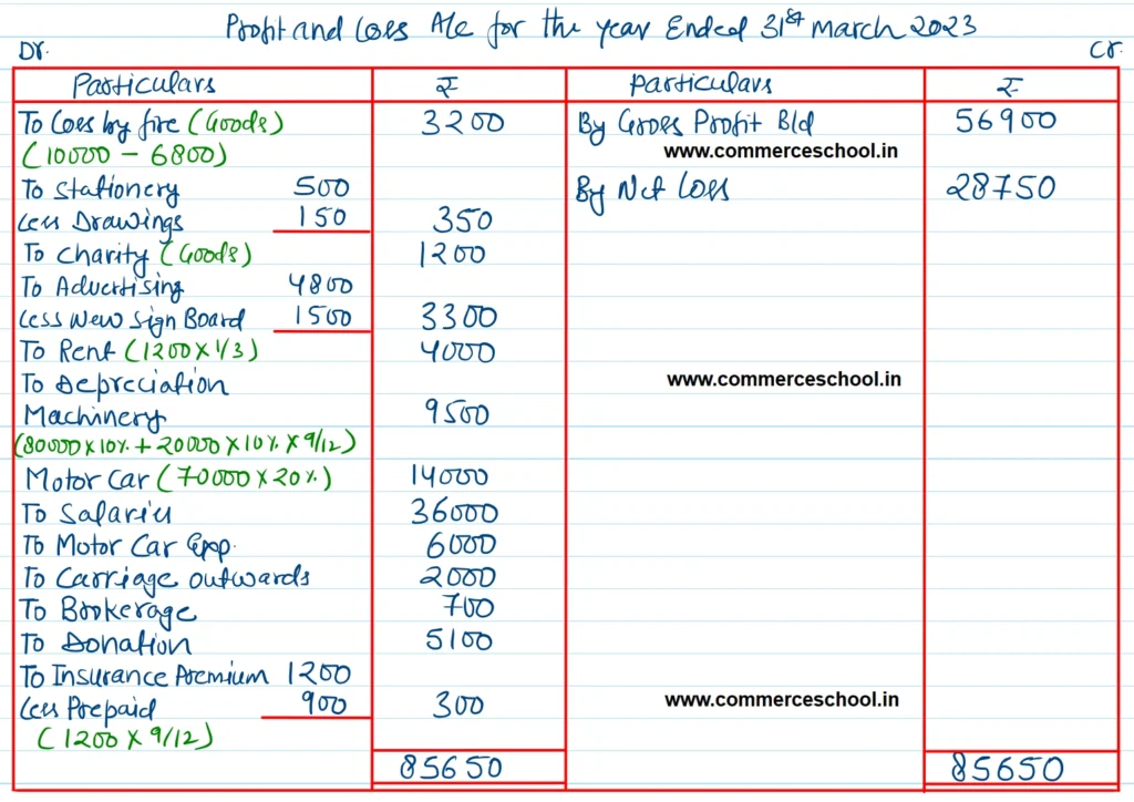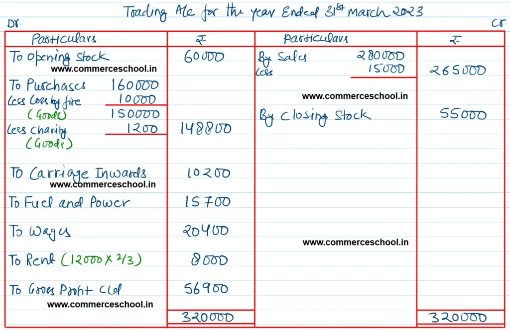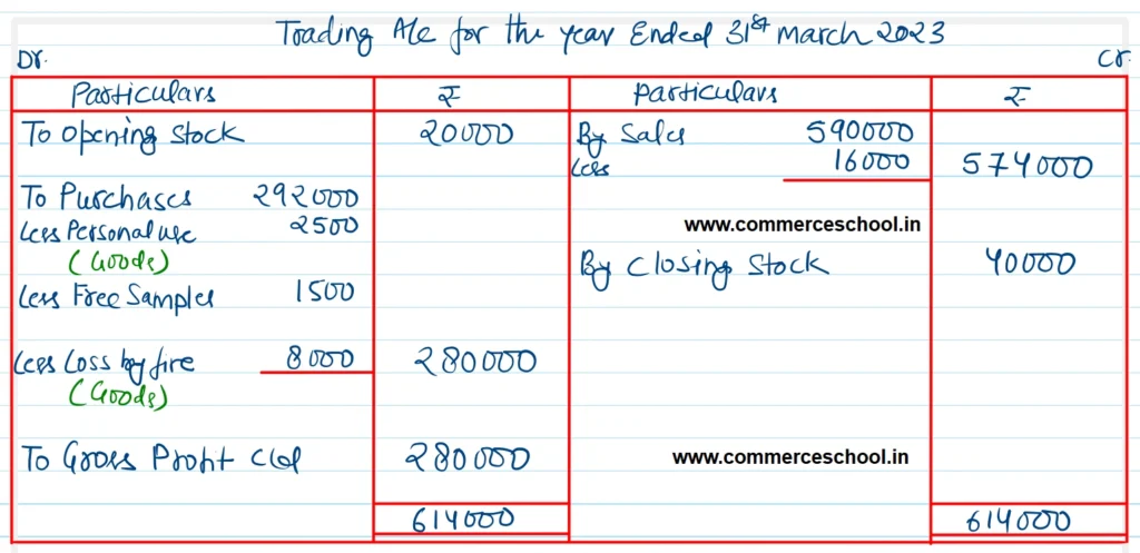 (1) Closing Stock ₹ 55,000. Stock valued at ₹ 10,000 was destroyed by fire on 18th March, 2023 but the Insurance Company admitted a claim of ₹ 6,800 only which was received in April, 2023.