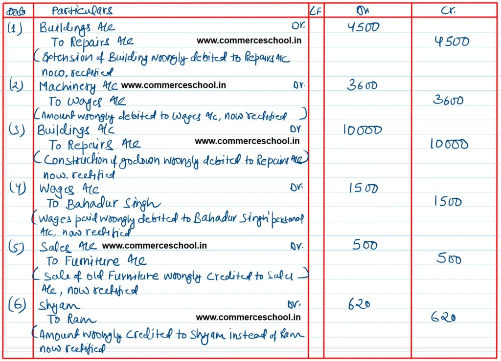 (6) A cheque of ₹ 620 received from Ram, has been wrongly credited to Shyam.
