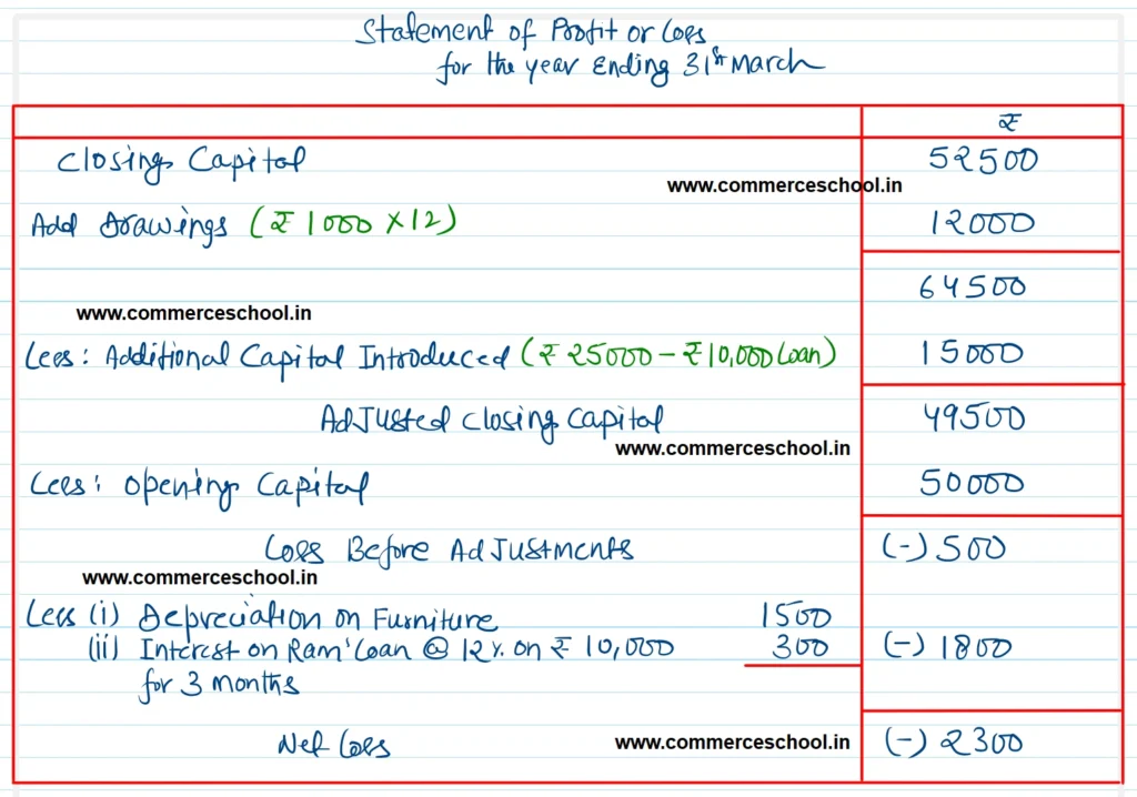 Actual drawings were not known but his living expenses are ₹ 1,000 p.m. Depreciate furniture by 10%. Interest on loan is due @ 12% p.a.