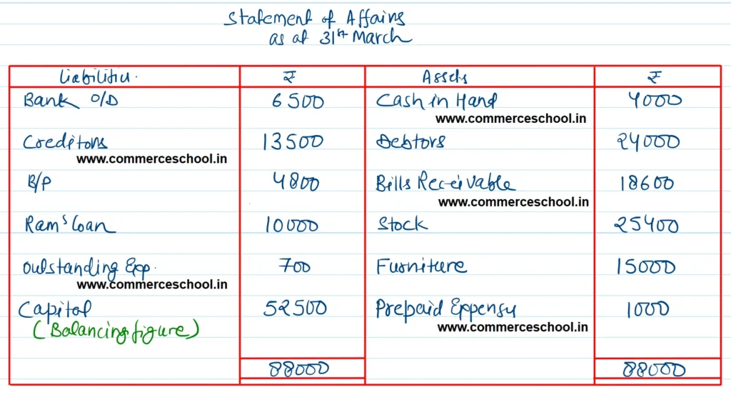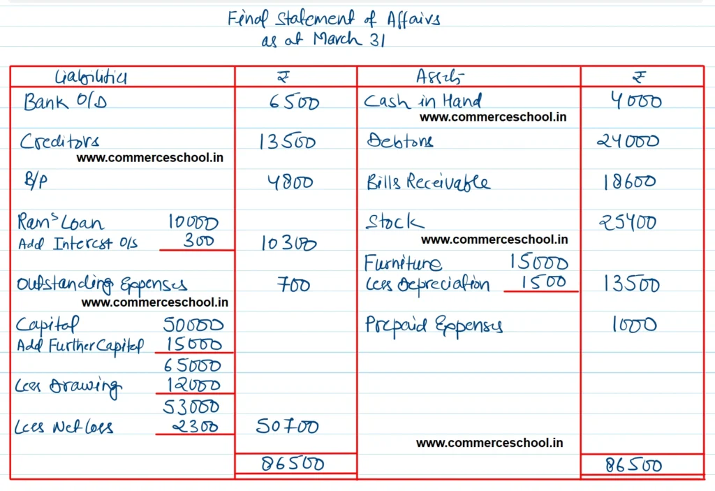 Liabilities: Creditors ₹ 13,500; B/P ₹ 4,800; Ram’s Loan ₹ 10,000; Outstanding expenses ₹ 700.
