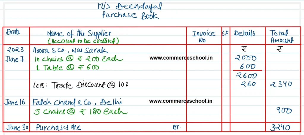 | June 16 | Purchased from Fateh Chand & Co., Delhi 5 Chairs @ ₹ 180 each. |