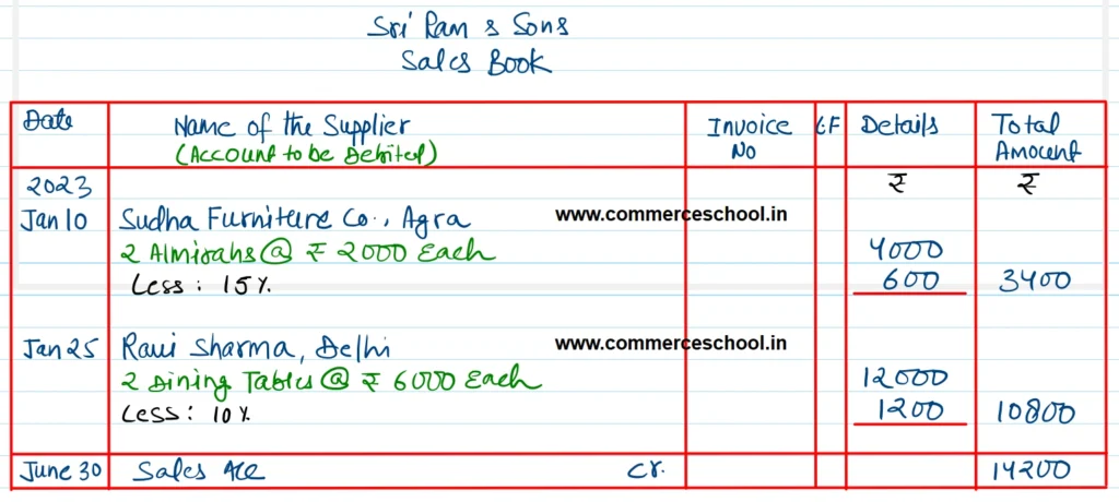| June 25 | Sold to Ravi Sharma, Delhi 2 Dining Tables @ ₹ 6,000 each Less: 10% |