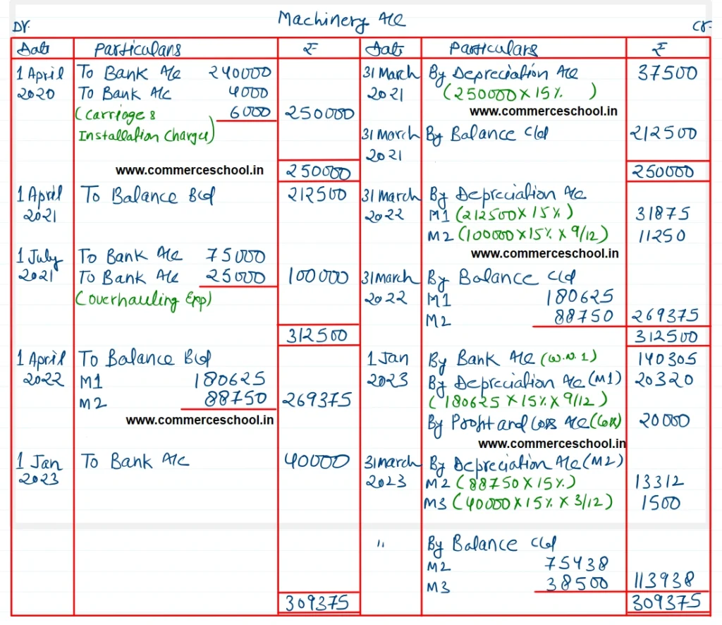 Ashoka Ltd. bought a machine on 1st April, 2020 for ₹ 2,40,000 and spent ₹ 4,000 on its carriage and ₹ 6,000 towards installation cost. On 1st July, 2021 it purchased a second hand machinery for ₹ 75,000 and spent ₹ 25,000 on its overhauling. ON 1st January, 2023 it decided to sell the machinery bought on 1st April, 2020 at a loss of ₹ 20,000. It bought another machine on the same date for ₹ 40,000. Company decided to charge depreciation @ 15% p.a. on written down value method. Prepare machinery account for 3 years. Books are closed each year on 31st March.