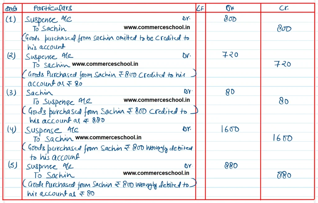 (1) Goods costing ₹ 800 purchased from Sachin on credit were omitted to be credited to his account.