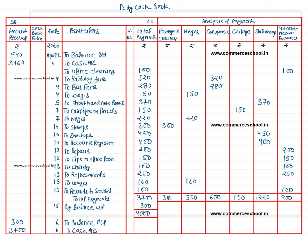 | April 12 | Paid for repairs ₹ 200, gave tips to office peon ₹ 150. |
