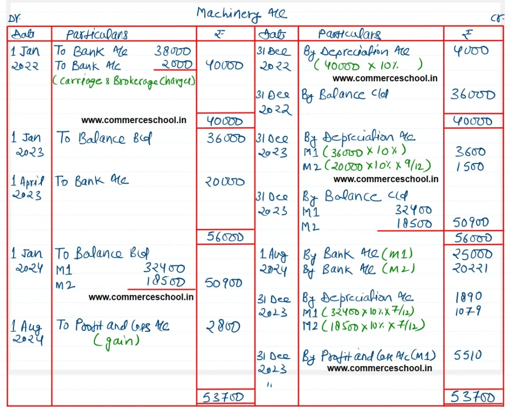 A limited company purchased on 01-01-2022 a plant for ₹ 38,000 and spent ₹ 2,000 for carriage and brokerage. On 01-04-2023 it purchased additional plant costing ₹ 20,000. On 01-08-2024 the plant purchased on 01-01-2022 was sold for ₹ 25,000. On the same date, the plant purchased on 01-04-2023 was sold at a profit of ₹ 2,800. Depreciation is provided @ 10% per annum on diminishing balance method every year.