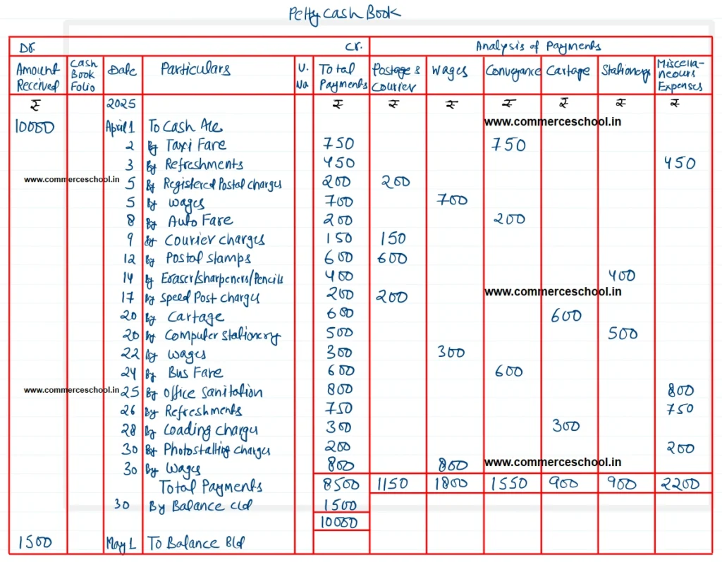 [Ans. Petty cash balance ₹ 1,500; Postage & Courier ₹ 1,150; Wages ₹ 1,800; Conveyance ₹ 1,550; Cartage ₹ 900; Stationery ₹ 900; Miscellaneous Expenses ₹ 2,200.]