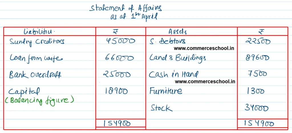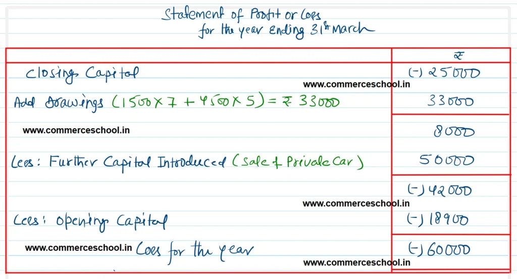 During the year Mr. White sold his private car for ₹ 50,000 and invested this amount into the business. He withdrew from the business ₹ 1,500 per month upto 31st October, 2022 and thereafter ₹ 4,500 per month as drawings. You are required to prepare a statement of profit or loss and a statement of affairs as at March 31, 2023.