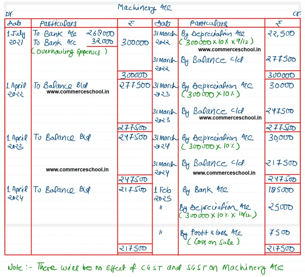 Chandra Ltd. purchased a second-hand machine for ₹ 2,68,000 plus CGST and SGST @ 6% each on 1st July, 2021. They spent ₹ 32,000 on its overhaul and installation. Depreciation is written off 10% p.a. on the original cost. On 1st February, 2025, the machine was found to be unsuitable and sold for ₹ 1,85,000. Prepare the Machinery A/c for four years assuming that accounts are closed on 31st March.