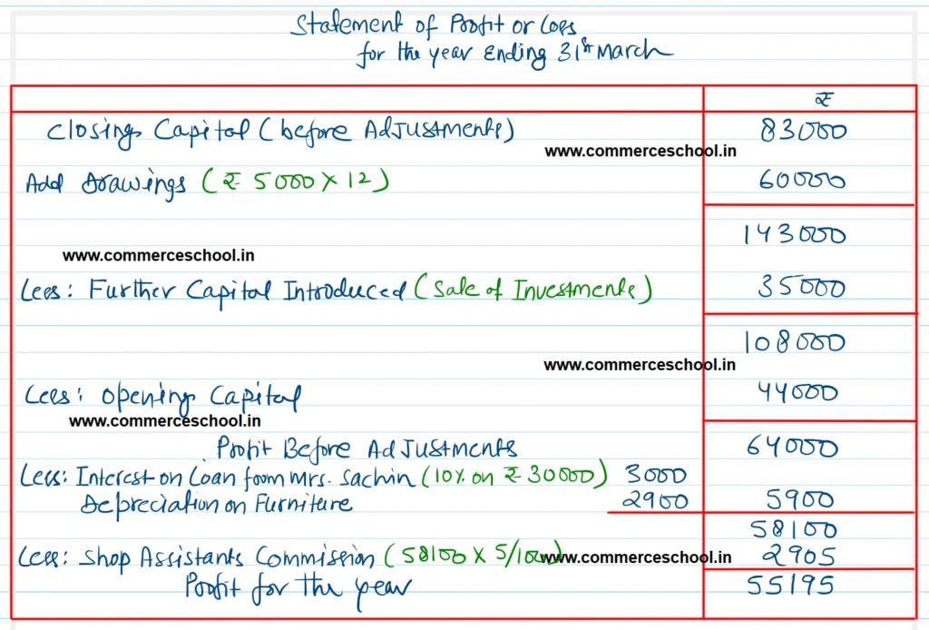 At the end of the year 2022-23, it was found that full year’s interest on loan from Mrs. Sachin had not been paid. Depreciation @ 10% per annum was to be provided on furniture for the full year. Shop assistant was to be given a share of 5% on the profits ascertained before charging such share.
