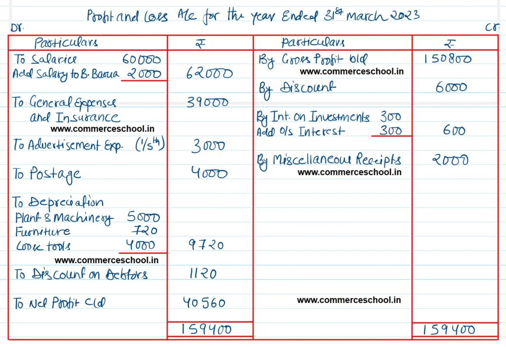 (2) Interest on Investments shown on the Cr. side of P & L A/c will be ₹ 300 + ₹ 300 = ₹ 600. Investments shown on the Assets side will be ₹ 6,300, i.e., ₹ 6,000 + ₹ 300 for accrued interest.