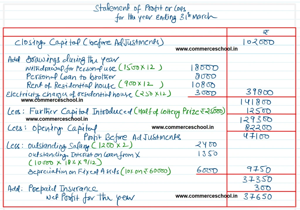 He withdrew from the business ₹ 1,500 per month for his personal use and ₹ 8,000 for giving a personal loan to his brother. He also used a house for his personal purposes, the rent of which at the rate of ₹ 900 per month and electricity charges at an average rate of ₹ 250 per month were paid from the business account.