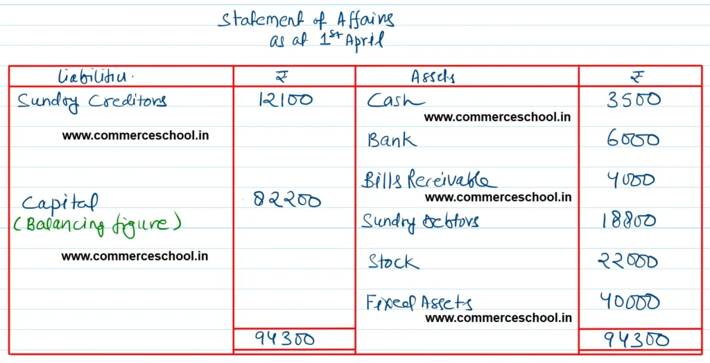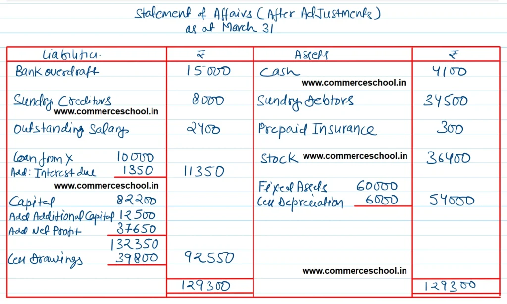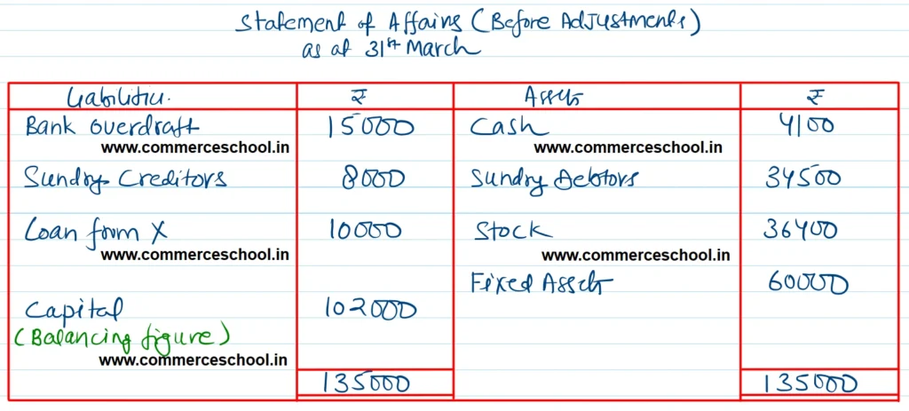 [Ans. Opening Capital ₹ 82,200; Closing Capital ₹ 1,02,000. Net Profit ₹ 37,650; Total of Final Statement of Affairs ₹ 1,29,300.]