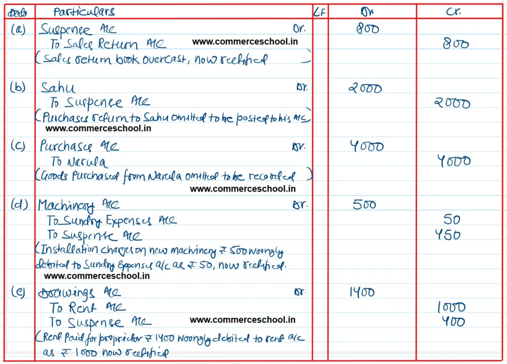 (d) Installation charges on new machinery purchased ₹ 500 were debited to sundry expenses account as ₹ 50.