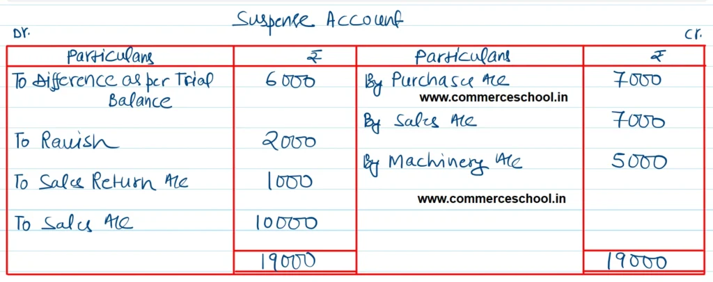 (e) Machinery purchased for ₹ 10,000 was posted to Purchases Account as ₹ 5,000. Rectify the errors and prepare Suspense Account.
