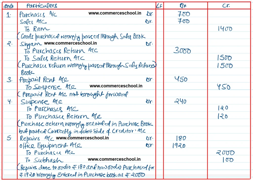 Hint:- In item (4), ₹ 240 will be debited to Suspense A/c; ₹ 120 will be credited to Purchase Return A/c and ₹ 120 will also be credited to Purchase A/c.