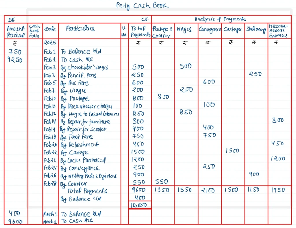| Feb. 1 | Received from cashier ₹ 9,250, the amount required to make up the amount of the ‘imprest’ viz., | 10,000 |